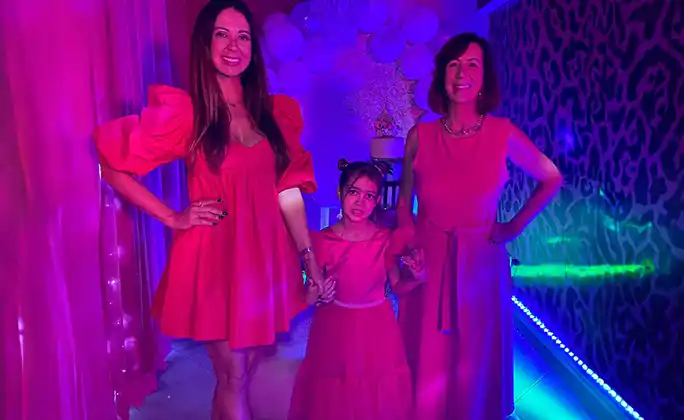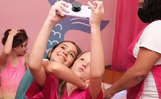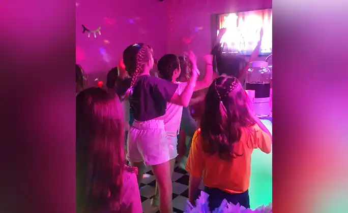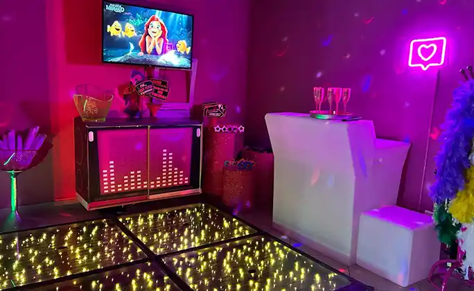 • Karaokê com baladinha: músicas animadas para cantar em grupo, muitos passinhos na pista de led, com acessórios de balada.
